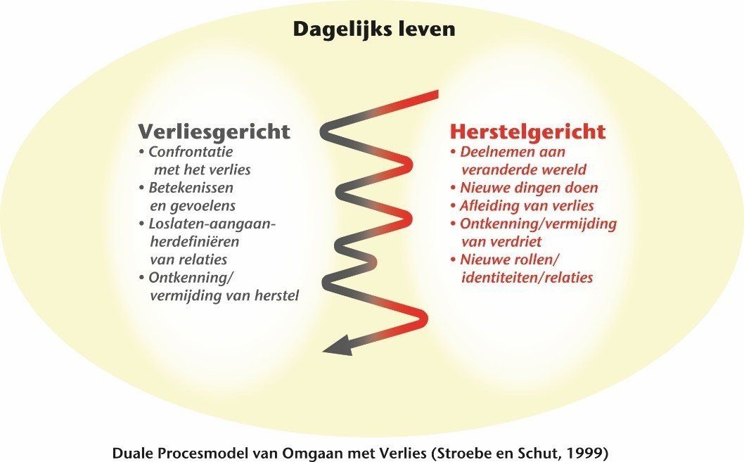 Rouwen is een slingerend proces. Het Duale Procesmodel van Omgaan met Verlies (Stroebe & Schut, 1999) laat dit goed zien, zie de afbeelding hieronder. Een rouwend persoon beweegt dynamisch heen en weer, niet volgens vaste patronen. Hij of zij beweegt tussen ‘de confrontatie met het verlies enerzijds’ en ‘het vermijden van het verlies’ anderzijds.