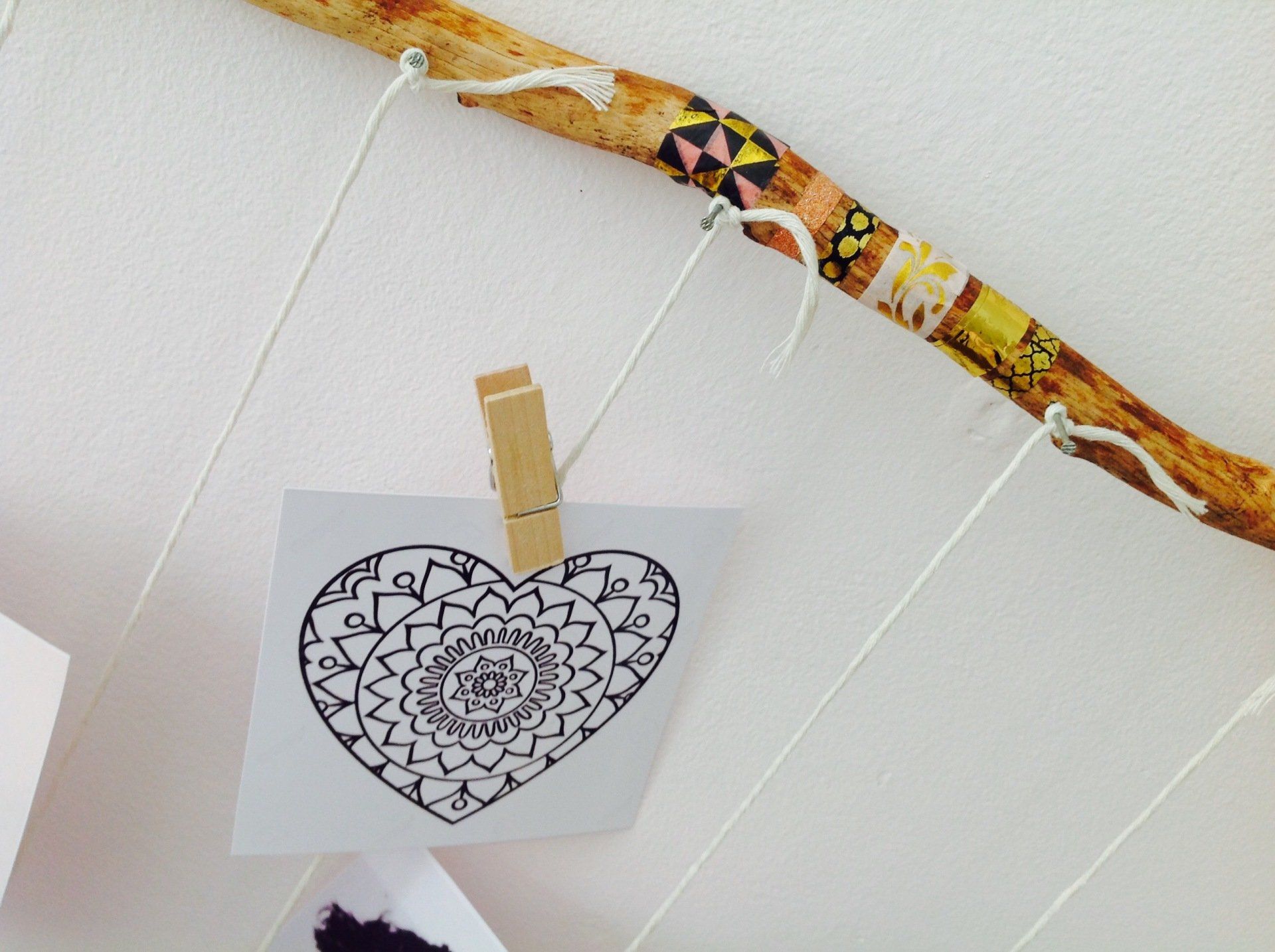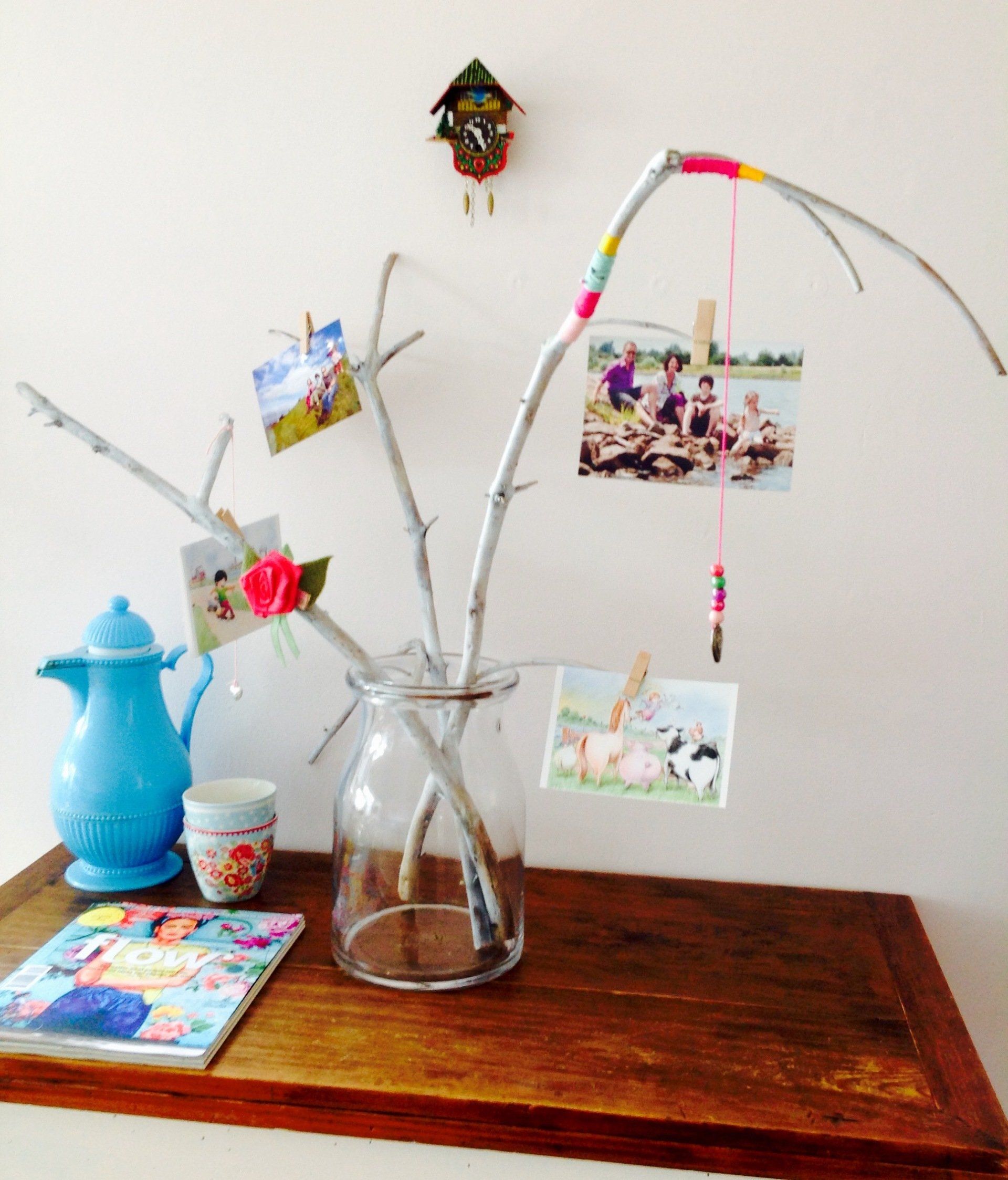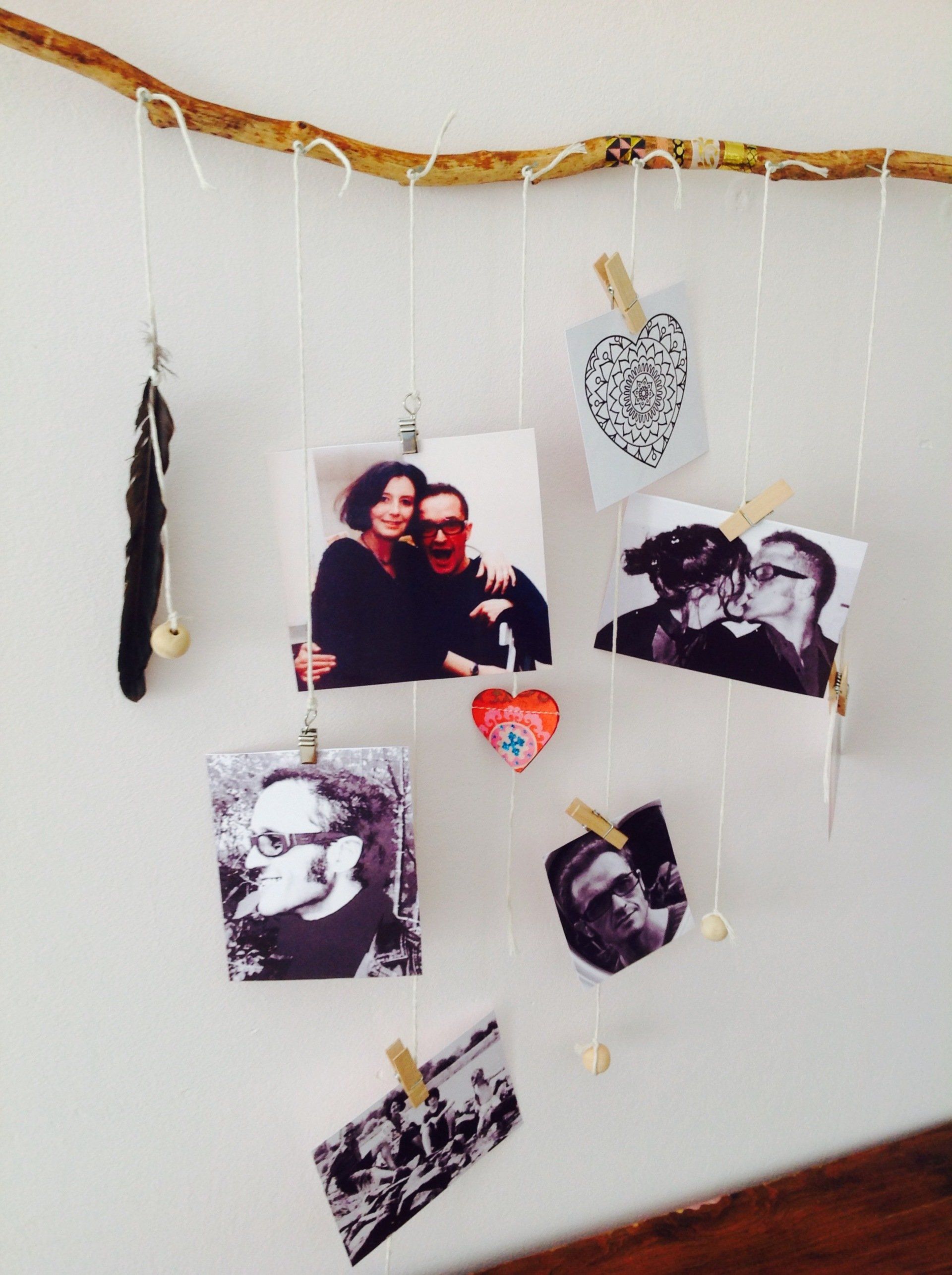 Bevestig nu de foto's met een mini wasknijpertje vast aan de touwtjes.