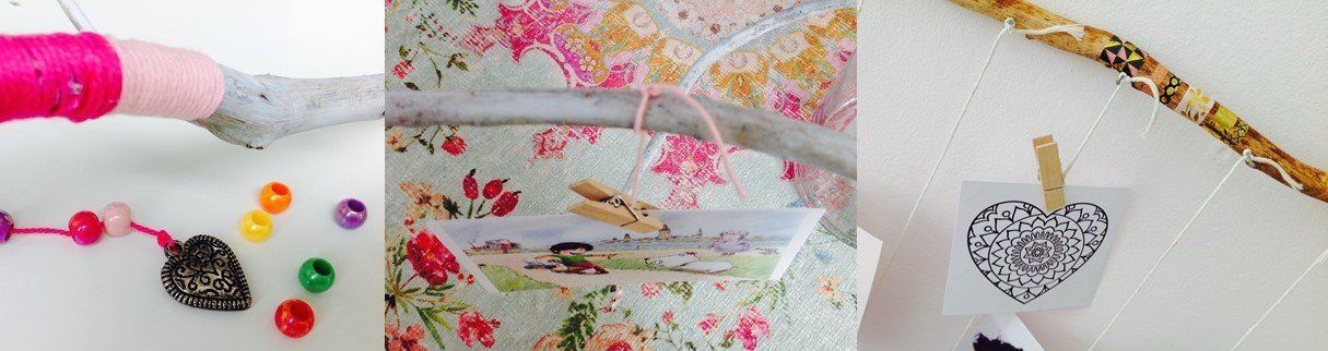 Knip de draden of touwtjes af op je gewenste lengte. Knoop deze één voor één aan de spijkertjes die in de tak zitten.